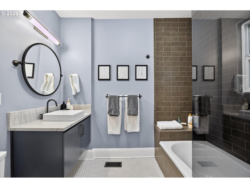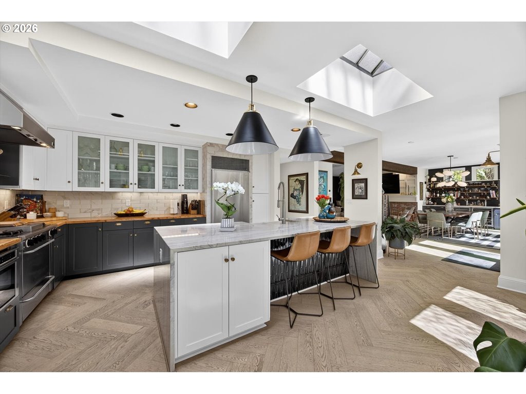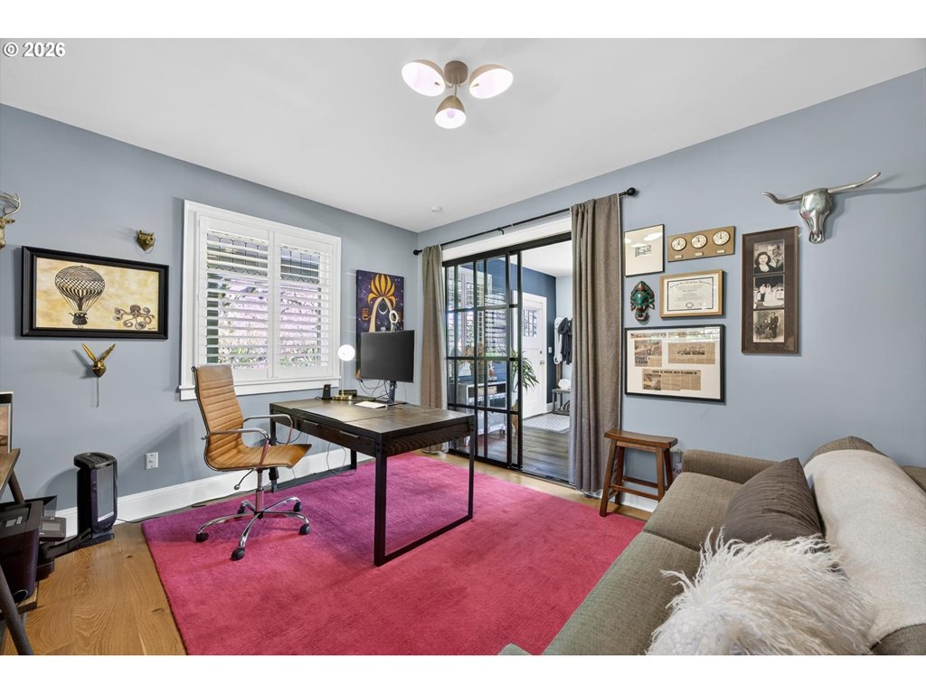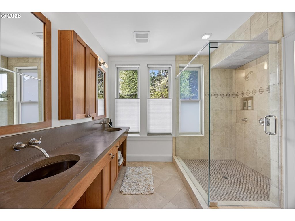 Tucked into a secluded lot just minutes from the city and quick access to Hwy 26, this stunning custom farmhouse offers convenience, comfort and refined style. Set on over half an acre of beautifully landscaped grounds, the property invites you to slow down and enjoy its serene, private atmosphere. Mature trees and seasonal foliage surround the home, while a series of thoughtfully designed outdoor spaces create a true retreat. Winding stone paths leading to raised garden beds and additional green space contribute to the home’s tranquil, zen like setting. Inside, the home showcases beautiful tile work, rich hardwood floors, a custom bar and elegant plantation shutters. Skylights and expansive windows fill the interior with natural light, enhancing the warm and welcoming ambiance. The open kitchen is a centerpiece, featuring a large island, high end appliances, and French doors that connect seamlessly to the outdoor living areas while the living room and cozy fireplace provide the perfect setting for relaxed evenings. The top floor primary suite serves as a sanctuary with a walk in shower, dual sinks, soaking tub and walk in closet. On the middle level, two additional bedroom suites and a fourth bedroom/office surround the family room which opens directly to a private covered patio and hot tub. Adding even more flexibility, the detached studio serves as a charming guest cottage with a full kitchen and bath. With vaulted ceilings and large windows, this space is bright and airy, perfect for hosting guests, accommodating extended stays, or creating a private studio retreat. Just a few of the many updates include a newer roof (2020), water heater, EV charging, fencing and gates, all providing peace of mind while every detail of the home reflects thoughtful care and design. This exceptional property offers refined elegance and expansive indoor/outdoor living, an inviting haven where entertaining, relaxing, and everyday living come together effortlessly. [Home Energy Score = 4. HES Report at rpt.greenbuildingregistry.com/hes/OR10023650]